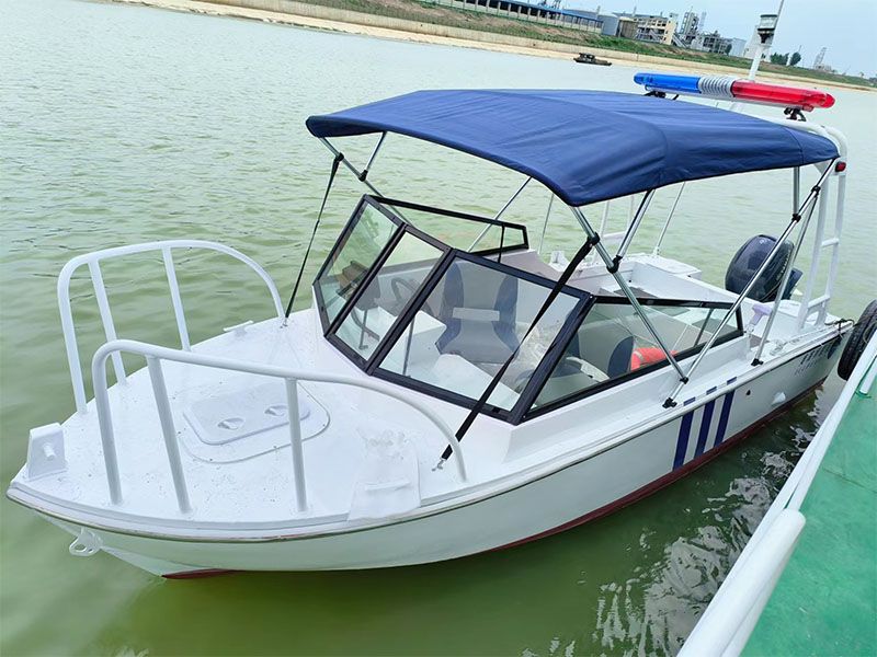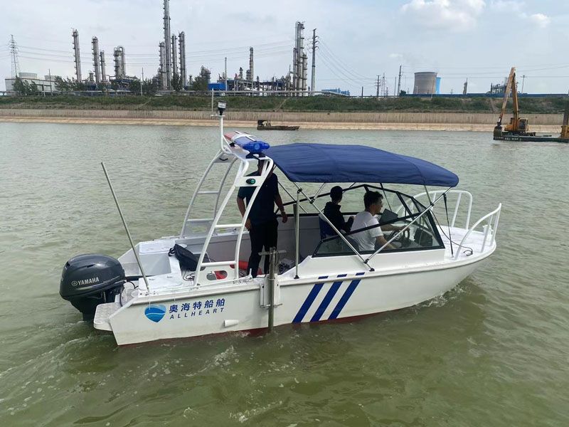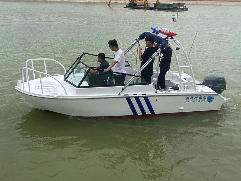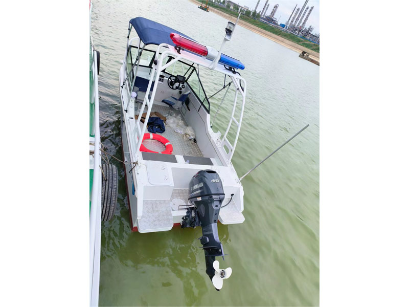 本艇為汽油掛機動力驅(qū)動的阿莫爾型高速執(zhí)法艇,具有劈浪好,航行更穩(wěn)定的特點。船體及甲板室采用帶有 CCS 證書的海洋級全鋁合金材料 5083-H116 焊接制作,其結(jié)構(gòu)強度高、重量輕、耐腐蝕。 本艇航區(qū)為內(nèi)核A級。產(chǎn)品描述