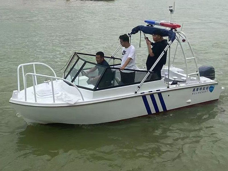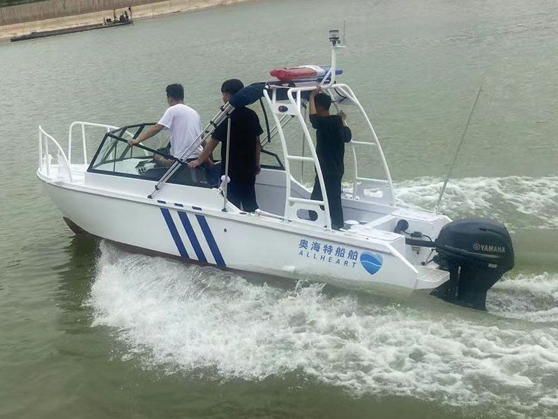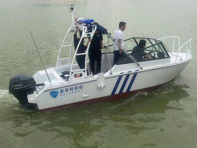 本艇為汽油掛機動力驅(qū)動的阿莫爾型高速執(zhí)法艇,具有劈浪好,航行更穩(wěn)定的特點。船體及甲板室采用帶有 CCS 證書的海洋級全鋁合金材料 5083-H116 焊接制作,其結(jié)構(gòu)強度高、重量輕、耐腐蝕。 本艇航區(qū)為內(nèi)核A級。產(chǎn)品描述