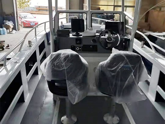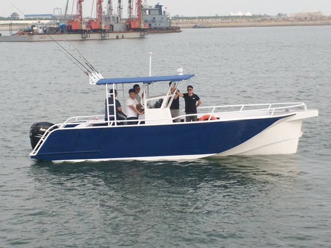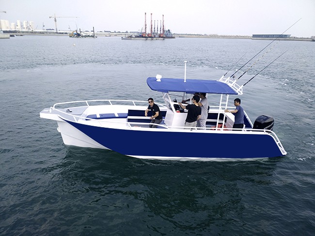 本艇為槽道型、M型船底的鋁合金高速艇,船艏豎直且尖薄,破浪性能優(yōu)越,也有效解決了槽道型艇分浪難、阻力大的問(wèn)題。無(wú)論是靜態(tài)還動(dòng)態(tài)船身橫搖輕、穩(wěn)性好。本艇前后甲板空間大,適合海釣。中控駕駛臺(tái),駕駛視野好。產(chǎn)品描述